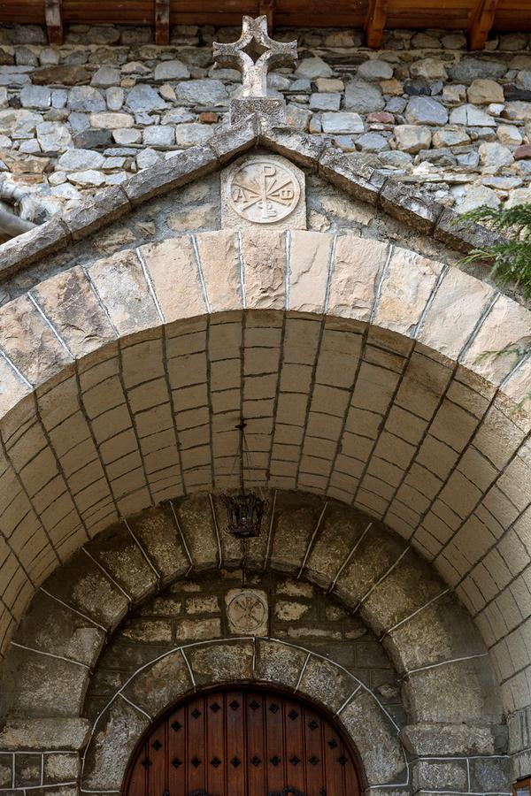 La puerta abre en el muro sur, hacia los pies. Es en arco de medio punto, surmontado por otro similar de construcción reciente en el que apea el pórtico; entre ambos, un pequeño crismón de procedencia desconocida. Está precedida por un pórtico de planta aproximadamente cuadrada, realizado en sillares, abierto al frente por arco de medio punto y cubierto por cañón, de construcción reciente.
