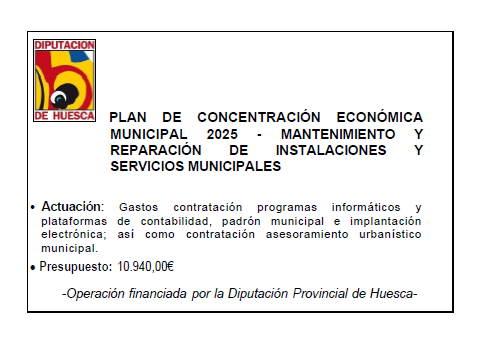 Subvención de Diputación Provincial de Huesca para gastos contratación, programas informáticos y plataformas de contabilidad, así como asesoramiento urbanístico y mantenimiento depuradora.